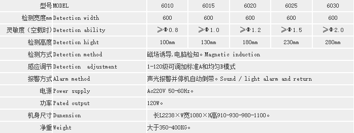 說明:檢針機靈敏度的高低由檢測高度(即通道或龍門)來決定最高檢測精度。龍門越高,靈敏度就相應降低。以上對應的高度和檢測標準是在空機狀態下的檢測結果;檢測通道高度和寬度,都可以按要求定做!