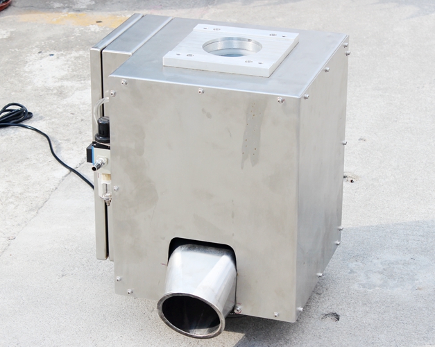 原料從料斗或送料器自由下落進(jìn)入金屬分離器,如果沒有金屬雜質(zhì),原料會(huì)直接通過金屬分離器流向下端的出料口。如果檢測(cè)器檢測(cè)到原料中含有金屬,那么控制器立刻啟動(dòng)分離板將金屬物和部分原料一起導(dǎo)向側(cè)面的排料口,然后分流板迅速恢復(fù)至正常的位置,分流板速度可調(diào),金屬分離器的檢測(cè)精度也可根據(jù)生產(chǎn)需要調(diào)節(jié),最小可檢測(cè)并分離出Φ 0.2mm的金屬顆粒。